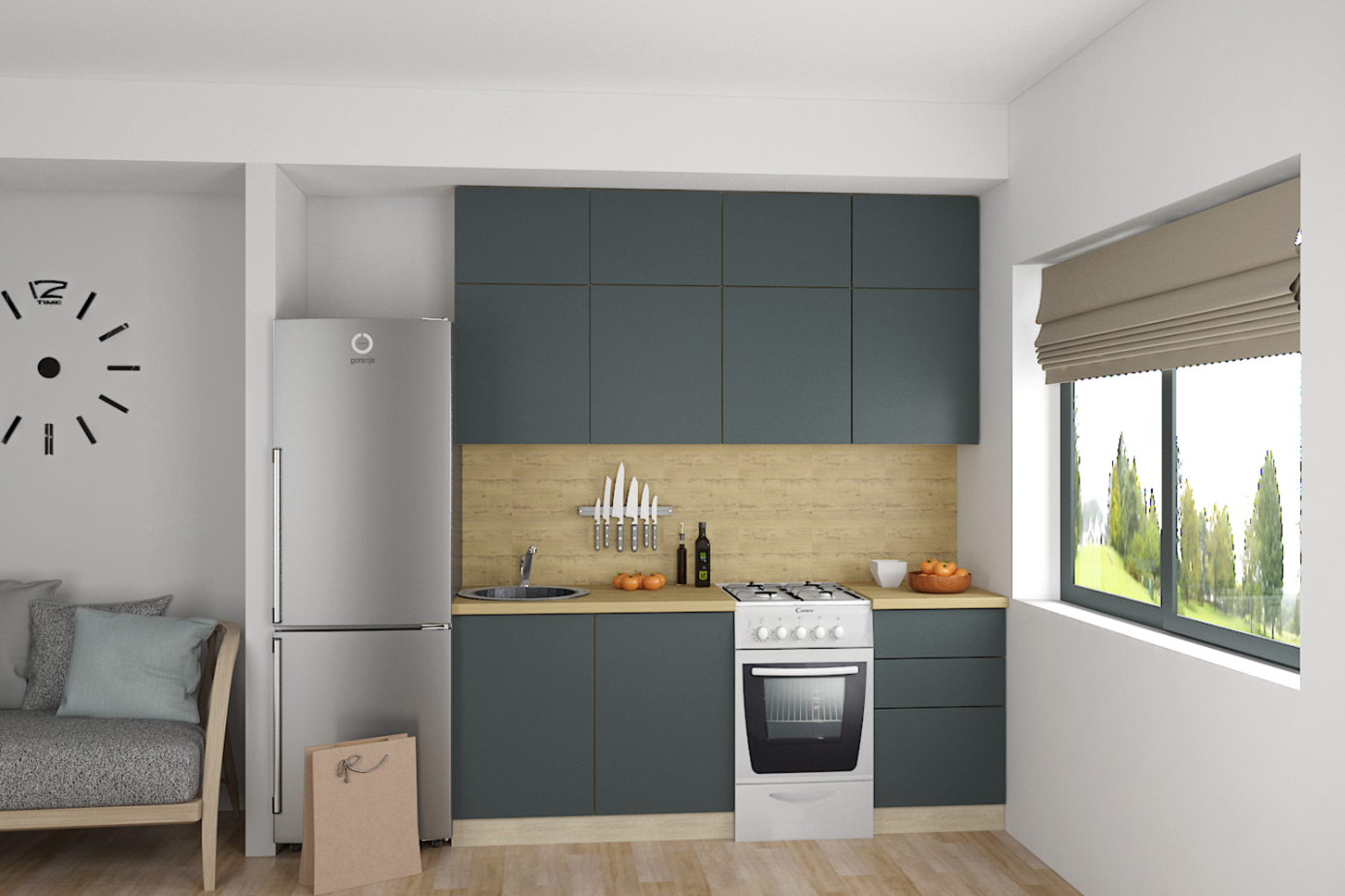 Особенность данной кухни заключается в полном отсутствии накладных ручек. У вас заняты руки? Вы с легкостью сможете открыть любую дверцу всего одним нажатием. Такая конструкция визуально облегчит небольшое пространство, сделает узкие проходы комфортнее, убережет вас и ваших детей от ушибов и травм.